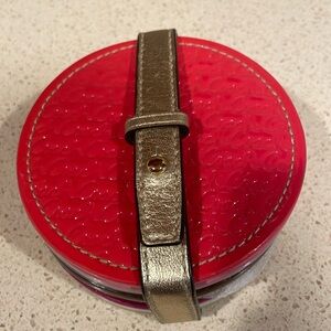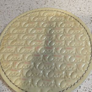 Rare new set of 8 different colored leather coasters all with Coach embossed on them. Metallic gold leather strap to hold together. Minor color transfer on the lime & yellow only.