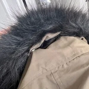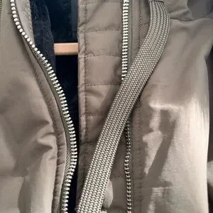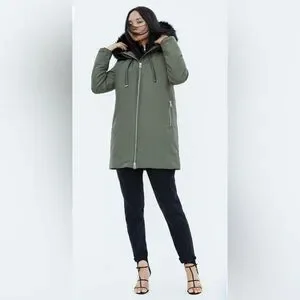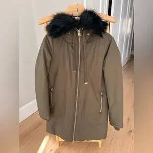 Stylish olive green parka from Zara. Water repellant, lined and has a removable hood. Features a black faux fur trimmed hood, side pockets and an knit inner cuff. Longer length covers the hip and perfect for cold weather. Double ended zip for leg comfort.