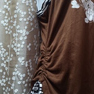 Stylish brown tank top with 'Lucky' horseshoe design. Zebra print accents add flair. Ideal for casual outings.