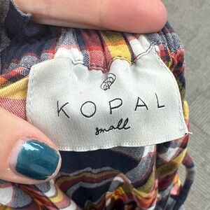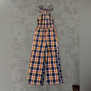 Such a cool handmade jumpsuit from Anthropologie brand Kopal. In a navy, yellow, and red plaid. Size S. Has a halter tie top. In excellent preowned condition with no visible flaws.