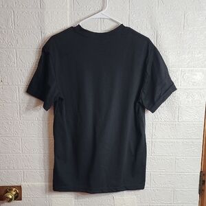 Black graphic tee with colorful text saying 'Hold On, Let Me Overthink This'. Features pastel blue and pink lettering.