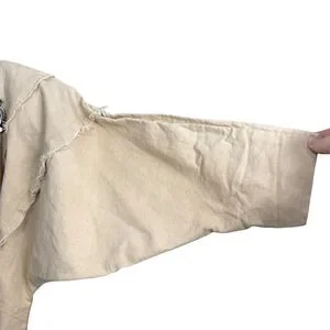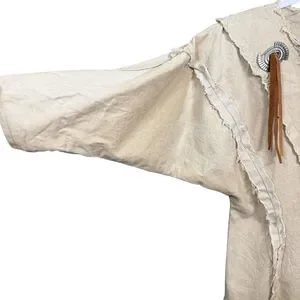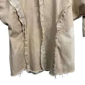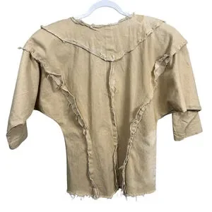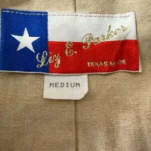 This pre-owned vintage Liz E. Parker western-style top features exposed raw seams, concho accents, and leather fringe detailing for a bold statement look. It is tagged a women’s medium and best fits approximately a size 8–10 with a relaxed silhouette. This piece is made in the USA with a Texas-made label and is marked as a sample piece, indicating it was produced for design or showroom purposes. The raw hems and seam details are intentional to the original design. The top is in good condition.