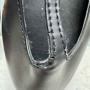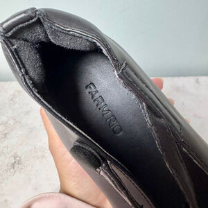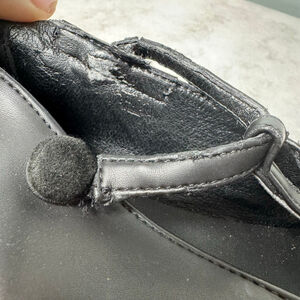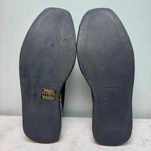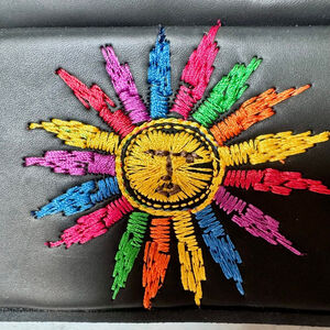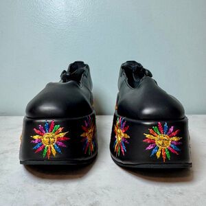 Farm Rio black Ballerina Platform Mary Jane shoes, size US 7.5, made in Brazil. The shoes feature a black manmade vegan leather upper and a thick platform sole adorned with vibrant rainbow sun embroidery. The platform measures approximately 2.5 inches high. Each shoe has a strap across the instep, secured by a button and elastic closure. These appear unworn with no wear to the sole, but there is deterioration to the edge-coating in some areas, and the T-strap on the right shoe is damaged. Otherwise I did not note any other damage or stains. The embroidery is stunning. Once repaired, they will be the perfect statement shoe. Smoke free home.