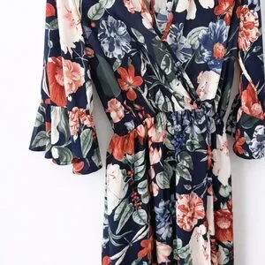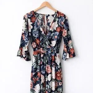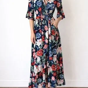 maxi dress, long dress, floral dress, botanical print, flower pattern, navy blue, midnight blue, deep blue, red, coral, blush pink, ivory, white, green, leafy, chiffon, lightweight fabric, flowy material, soft drape, breathable, wrap style, faux wrap, V-neck, tie waist, cinched waist, elastic waist, A-line silhouette, relaxed fit, feminine fit, tiered skirt, ruffle hem, three-quarter sleeves, flutter sleeves, romantic style, boho chic, cottagecore, vintage-inspired, elegant, chic, stylish, trendy, spring summer, transitional season, wedding guest, date night, brunch outfit, baby shower, garden party, vacation wear, casual dressy boho chic, coastal, cali girl, bohemian, Easter, wedding, wedding guest
