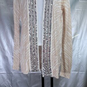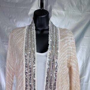 Elevate your wardrobe with this refined Tory Burch cardigan, designed for effortless sophistication. Crafted in a soft neutral beige with an elegant tonal texture, this lightweight piece drapes beautifully for a polished yet relaxed silhouette. The open-front design is accented with a delicately embellished sequin trim, adding a subtle shimmer that catches the light without overpowering the look.