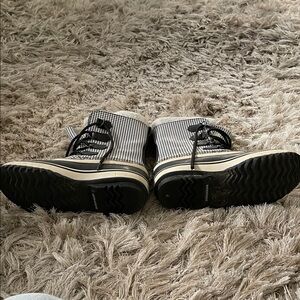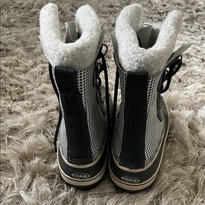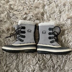 Chic Sorel boots with a houndstooth pattern. Ideal for winter wear.