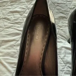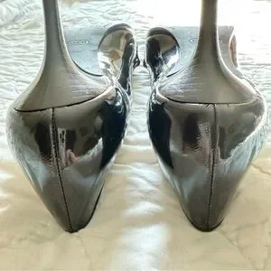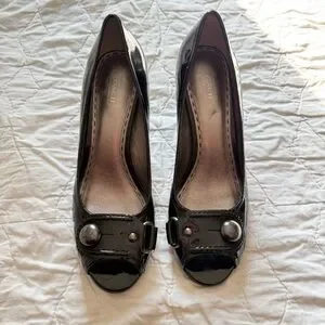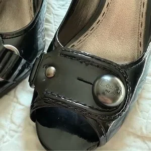 Coach Women’s Black Shiny Open Toe Heels Pumps with Coach Button Buckle Size 9 B US 38 EU