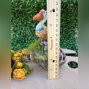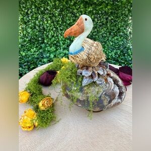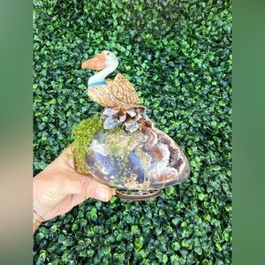 This is a one-of-a-kind, handcrafted piece, created by combining natural stone elements into a symbolic story of care, protection, and abundance. A pelican rests atop a hand-built citrine nest, which sits on an agate egg, accented with faux moss to evoke a natural, nurturing environment.