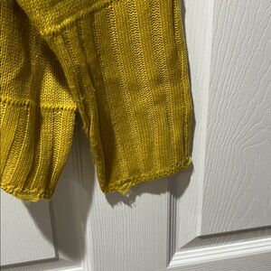Vibrant yellow sweater with multicolor patterns. Features crew neck and long sleeves. Perfect for a stylish look, with distressed hem.