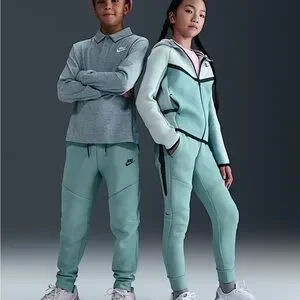 Nike Tech Fleece tracksuit with mint green and black accents. Includes zip-up hoodie and jogger pants, both size youth large. New with tags!