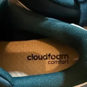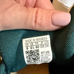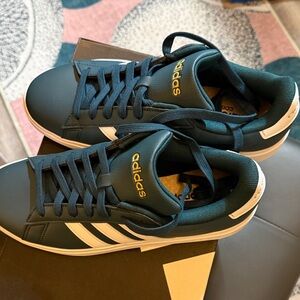 Stylish Adidas sneakers in teal with white stripes and pop of gold on tongue and heals. Comfortable and trendy for everyday wear. Tried on only, still have tag. Comes with box. Box has a tiny bit of damage.