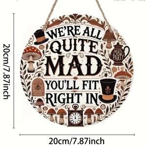 Circle sign with Alice In Wonderland design. Has holes for hanging. Brand new still in the packaging and never been used
