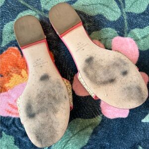 Chic pink sandals with raffia detail and colorful strawberry embroidery. Perfect for casual outings. Worn once. Size 6