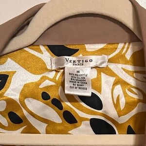 Elegant tan trench coat by Vertigo Paris. Features a bold patterned lining. Ideal for stylish layering. Lightweight. A little bit dressier based on the style of the shoulders and sleeves. Would be great for a layering piece really great for a trip if you want something that will keep you warm but be also easy to pack. Super cute lining. This does not have a belt.