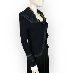 Chic black cardigan with teal blue & burgundy, & yellow-green accents. Features ruffled edges, velvet ribbon, and wool lace (Collar & bottom of sleeves).