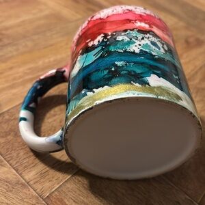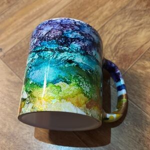 Absolutely beautiful rainbow “ink splatter” style mug set. These unique mugs will add a pop of color to your morning routine and are sure to be a crowd pleaser for your guests. It was hard to capture in the photos, but both mugs have shimmery/glittery accents. Mugs are in excellent, like new condition, and hold approximately 10 fl. Oz. each. Not sure of the artist as the mugs are not marked.