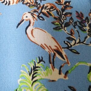 Shirt collar. Button up front. Belted. Long sleeves with elastic at wrist. Jungle print with tigers, palm trees, and tropical birds.