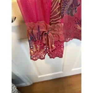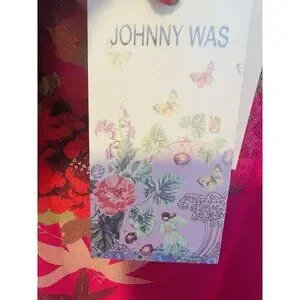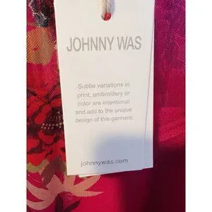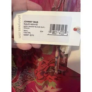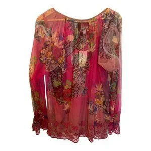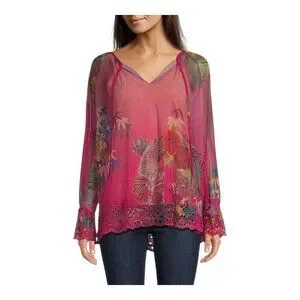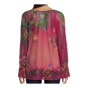 JOHNNY WAS Mazzy Floral Print Embroidered Mesh Large Split V-Neck Peasant Blouse