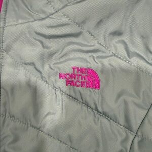 The North Face reversible Quilted jacket with gray exterior and pink details. Ideal for outdoor wear.
