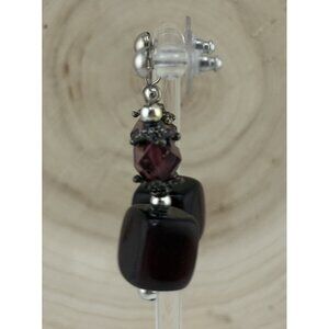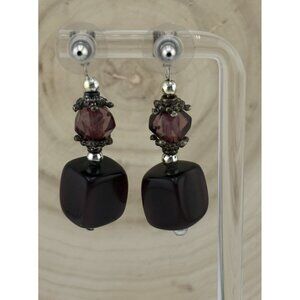 Beautiful vintage boho-style dangle earrings featuring faceted purple glass beads, dark cube beads, and decorative silver-tone spacers. These earrings have a handcrafted artisan look and measure approximately 1.75–2 inches in length.