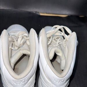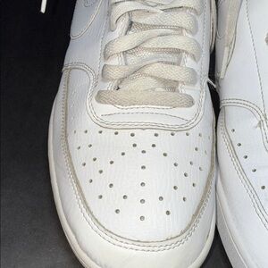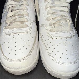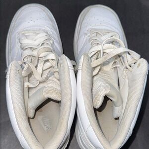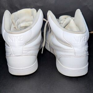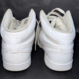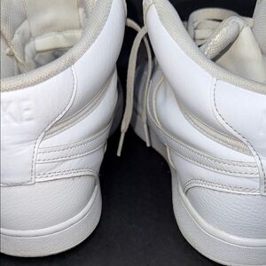 Clean and classic Nike Court Vision Mid sneakers in all white, men’s size 11. Features leather upper, padded collar, and durable rubber sole — great everyday casual sneakers.