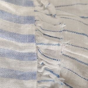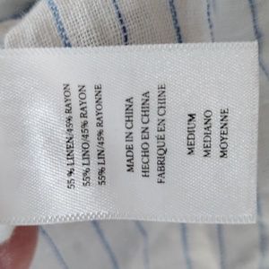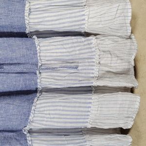 Rails blue and white tiered mostly linen Madeline Trio Stripe skirt, size medium. In very good pre-owned condition. Drawstring over elastic waist. Tiers have a raw edge. Fully lined. Waist 32" - 42", hips about 64", length 24". Item number 02266-522-400-101025.