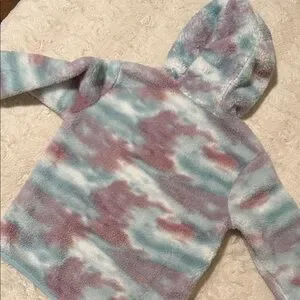 Soft fleece hoodie with a fun blue and pink pattern. Ideal for warmth and comfort.
