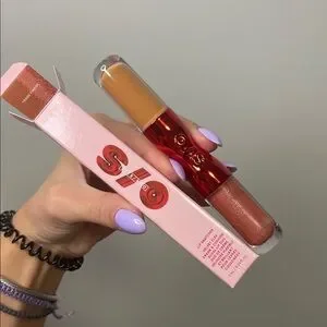 Shimmering red and nude gloss. Dual-ended for versatile looks. Smooth application.