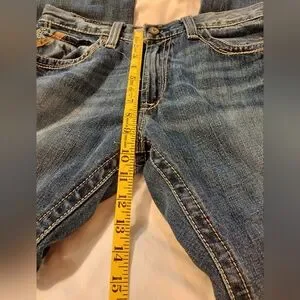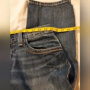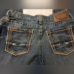 Work ready, relaxed, bootcut jeans by Ariat. Deep blue color. Reliable fits for riding or everyday use. Some wear on bottom hem as shown in the photos. #ranchwear #cowboy #western #premium denim