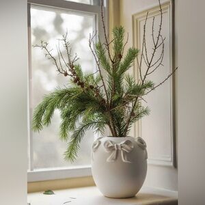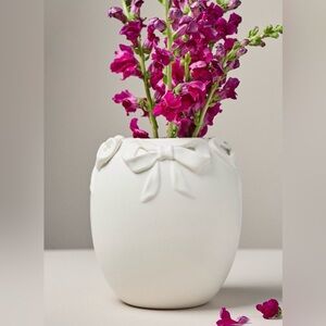This frosted stoneware vase is a bow-tiful addition for your bouquets.
