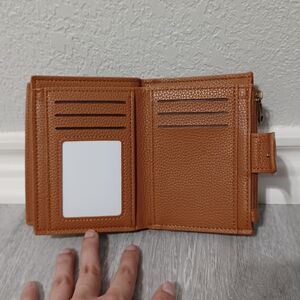 This brown, compact wallet from AIRKIT measures 5" x 3.75" x 1.25". Crafted from premium leather, it features an exterior slip-in pocket, 8 RFID-blocking card slots, 4 clear ID windows (2 detachable), 1 zippered coin pocket, and a full-length bill compartment