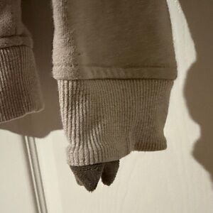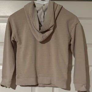 Keep your child cozy and stylish with this beige hoodie, perfect for everyday wear. Decor on sleeve. Small faint spot in center shown in last picture. Overall still great condition