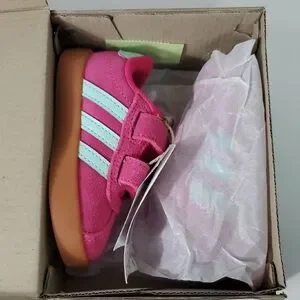 Bright pink suede sneakers with classic Adidas stripes. Easy hook-and-loop closure. Ideal for active play.