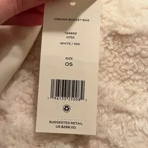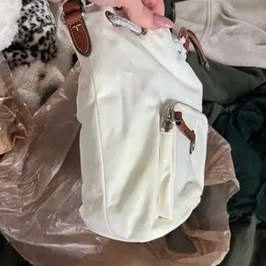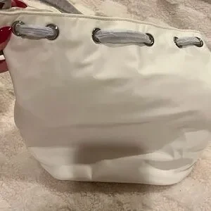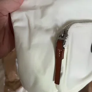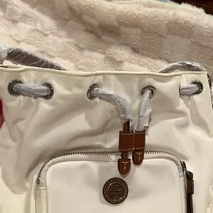 Chic Tory Burch nylon Virginia bag in cream with brown leather accents. Features a stylish front pocket and adjustable strap. Tags attached but there is some