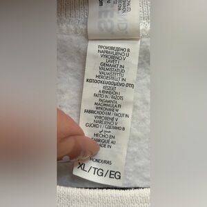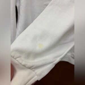 There are currently some stains on the front and sleeves as noted in pics. I am going to try again to get stains out but currently being sold as is. Everything else about the sweatshirt is in excellent condition.
