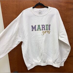 Mardi Gras graphic print novelty white, purple, green, gold sweatshirt size XL.