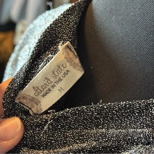 Statement Alter’d State metallic graphic tee featuring a “World Tour 1987” vintage-inspired design. Shimmery charcoal/black fabric with soft metallic sheen and relaxed, oversized fit.