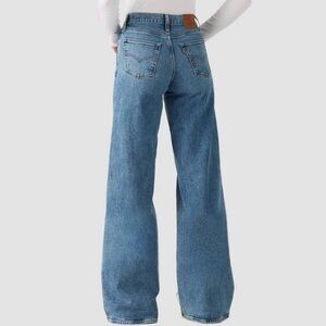 Stylish light blue jeans with a wide leg design. Perfect for a chic, casual look.
