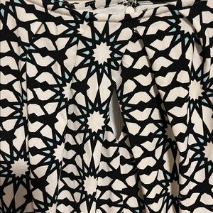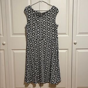 Maggy London, women’s sleeveless dress, geometric pattern, size 16W, zippered back and keyhole opening in front. This elegant black and white floral dress is perfect for any occasion. Its classic design offers a timeless look. Enjoy the comfort and style of this plus sized beautiful piece.