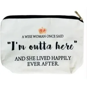 Say farewell to the daily grind and celebrate a new chapter with this stylish "I'm Outta Here" Canvas Makeup Bag! Brand new and never used, this makeup bag is more than just a cosmetic organizer; it's a statement piece for those embracing retirement or stepping into a well-deserved promotion. The "I'm Outta Here" statement adds a playful touch to this makeup bag, making it the perfect gift for someone bidding farewell to work or stepping up the career ladder. Compact and convenient, this makeup bag is the ideal size for carrying your daily beauty essentials or serving as a stylish travel pouch. Whether it's for a colleague retiring after years of hard work or a friend celebrating a well-deserved promotion, this makeup bag is a thoughtful and lighthearted gift.