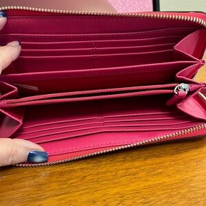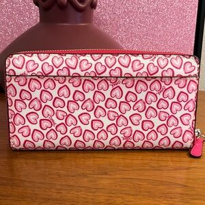 Stylish wallet with heart design. Features a charming pink hue. Ideal for everyday use.