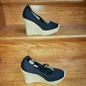 Mossimo 7 4" black/tan peep toe wedges EUC