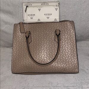 Elegant Guess satchel with signature logo design. Brown exterior with cream details. Ideal for daily wear. No callouts on bag! Minor brusing on The wallet.