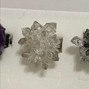 Stunning Herkimer‑style quartz statement ring featuring a brilliant cluster of natural clear quartz points. The multi‑point formation creates incredible sparkle, dimension, and light reflection from every angle. Set in a silver‑tone adjustable band, this piece is bold, eye‑catching, and perfect for anyone who loves powerful crystal jewelry.