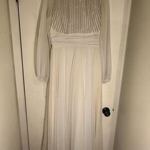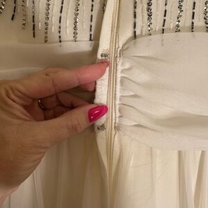 The Jack Bryan Beaded Chiffon Dress from the 1970s exudes elegance with its sheer sleeves and beaded bodice. Made in the United States, this original vintage piece in a classic white color is perfect for special occasions. The beaded style and chiffon material give it a luxurious eveningwear look, making it a standout choice for women who appreciate timeless fashion.