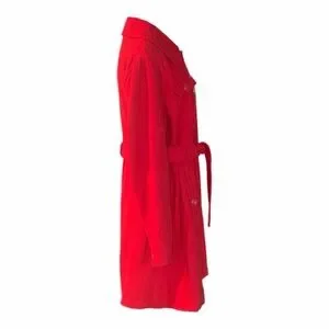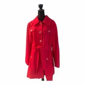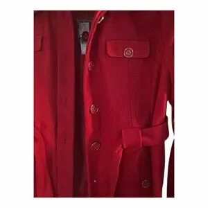 Brand new chic and bold red wool jacket with red and gold buttons and a stylish belt. Features button-up front and classic collar. Perfect for any occasion.