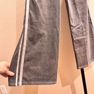 Stylish wide leg pants. Features white side stripes. Comfortable and trendy.