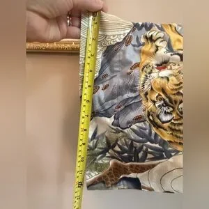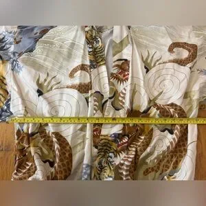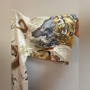 Vintage Japanese Tiger & Dragon Cotton Kimono Wrap Robe, 58 Inches Length. Multicolor 100% cotton kimono. Features dragons, tigers, and foliage motifs.