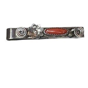 Vintage Navajo Sterling Silver Tie Clip Floral Design Coral Accent 2" Money Clip