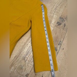 Chic Boden dress in mustard. Features 3/4 sleeves, pockets and a ribbed fabric for a comfortable fit. Ideal for versatile styling.